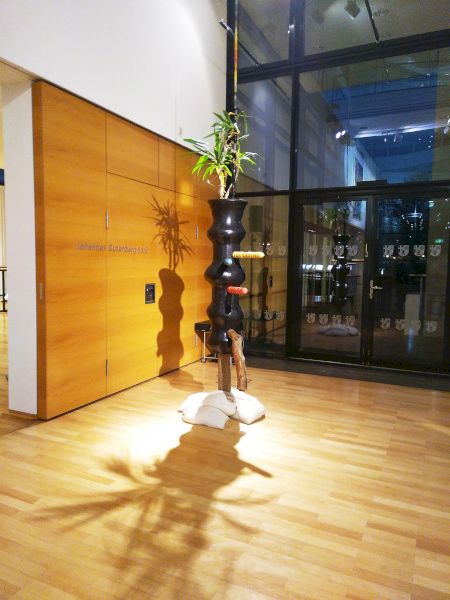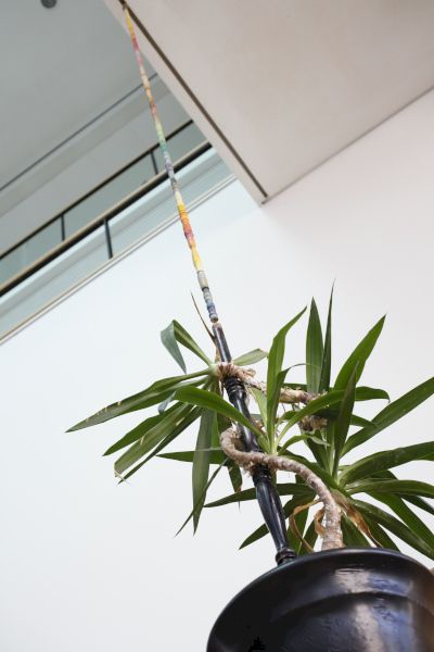 Wood, oilpastell colour, cloth donations, plastig bags, yucca palm, sandbags, ca. 60 x 60 x 300 cm, 2015